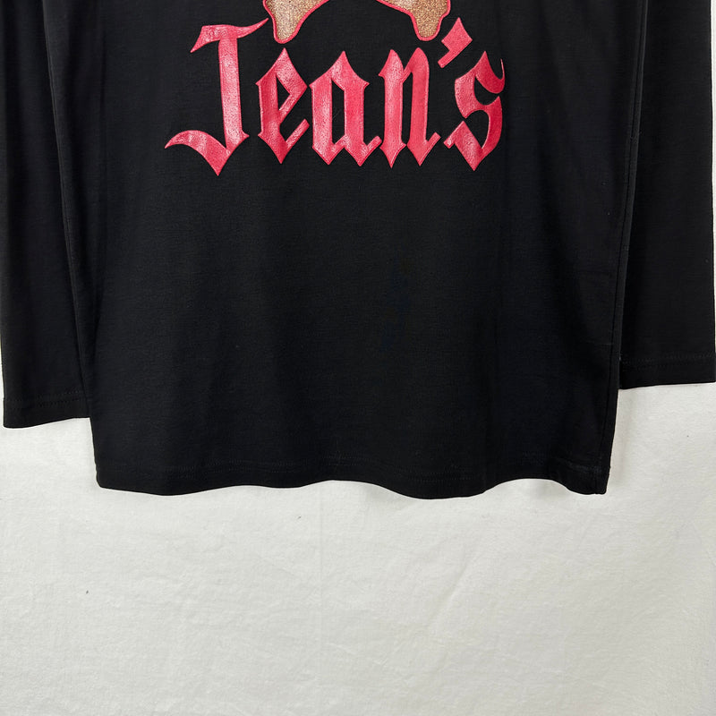 Vintage black Gaultier Jean’s turtle neck with bronze glitter skull print. The print has a rubbery texture and says ‘Gaultier Jean’s’ in a large red gothic font. On the back of the shirt there is a Gaultier Jean’s label below the turtle neck seam. This shirt has long sleeves with a unique seam detail going down the back of the arm. The material is a high quality, dense cotton jersey.