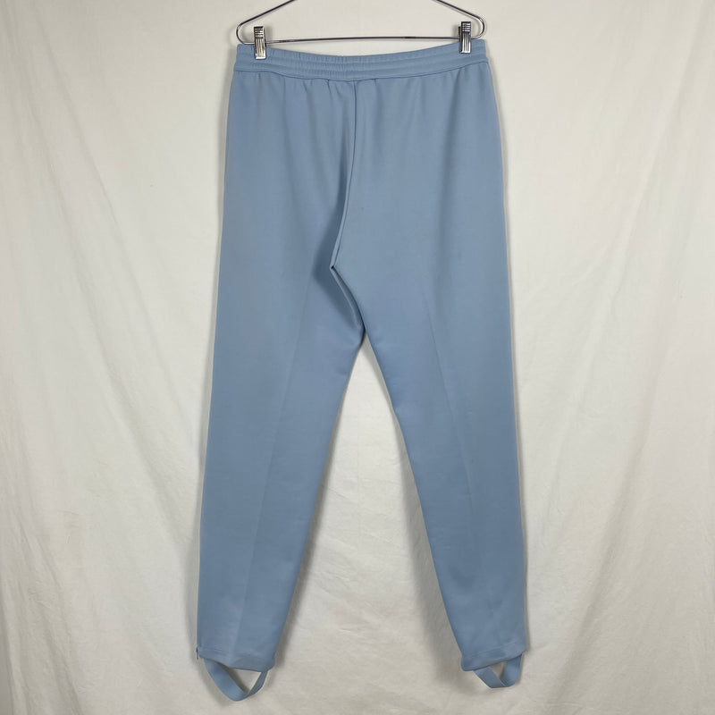 light blue, midweight, relaxed fit, elastic waist with drawstring, permanent pleat down front middle leg, two pockets, removable strap at pant cuff